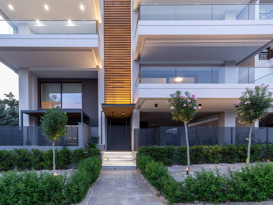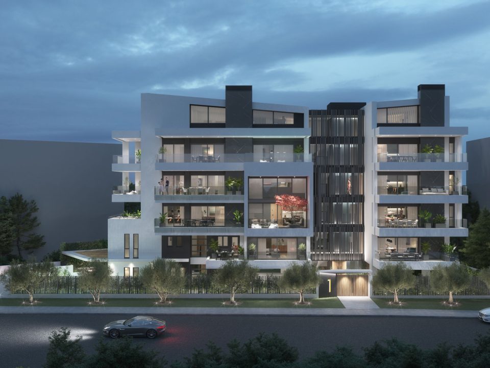 - Modern architectural apartment building under construction at 9 Lasithiou Street, Glyfada